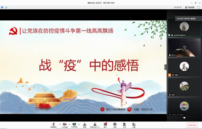 领导和老师给予他的关心和照顾;杨孝彬同学讲述了同村官母亲一起抗疫的故事,在抗议中领会到共产党员的使命与担当;张文博同学则在疫情暴发以来始终心系第二故乡湖北,并报名参加了当地中心医院的志愿服务,他说作为当代青年就要努力学习、帮困扶难、踏实朴实、引领带头。