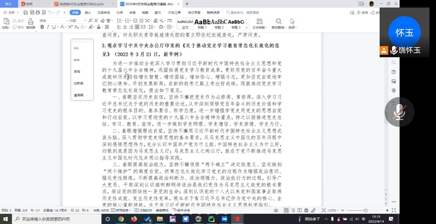 (通讯员:姚李昊升 龚文浩) 近日,为积极响应研究生院党委研究生工作部安排的4月政治理论学习安排,研究生工作部在全校研究生中开展了政治理论学习活动,本次活动以学习习近平主持中共中央政治局常务委员会会议,分析新冠肺炎疫情形势,部署从严抓好疫情防控工作、习近平参加内蒙古代表团审议时强调的“不断巩固中华民族共同体思想基础,共同建设伟大祖国”以及在省部级主要领导干部学习贯彻党的十九届六中全会精神专题研讨班开班式上发表重要讲话为主要内容。414日晚19点,电信学院研究生采用线上会议的形式开展了4月政治理论学习会议。