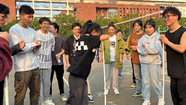 趣味运动会共有四个项目,分别是“友情你我他”、“步调一致”、“不倒森林”和“六人七足”。活动首先通过抽签的方式把同学们分成8支队伍,采用各个项目累积积分的形式作为最终的评分。8个队伍同台竞技,比赛项目丰富,趣味性十足,合作性强,将竞技与娱乐相结合,着重提高同学间的交流与合作。