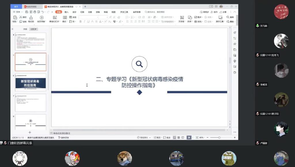 会上,辅导员、班主任传达了学校有关春季开学学生返校工作会议精神,对提前返校、延迟返校学生申请审批手续办理、学生返校行程安排报告等事项提了要求,强调了学生返校前、返校途中、返校后的安全注意事项,并开展了“七防”安全教育和诚信考试教育;组织全体同学共同学习了国务院联防联控机制综合组2023年1月7日印发的《新型冠状病毒感染疫情防控操作指南》, 通过学习文件内容,帮助同学们对当前的疫情防控有了更全面的认识。