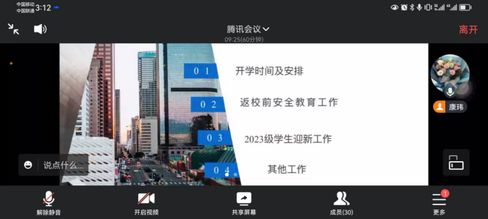 召开了2023年秋季研究生开学主题班会,通过线上会议的方式,分别在研究生新生班级和老生班级召开。两场会议由学院研究生会主席尚玉豪同学主持,康玮辅导员主讲,对秋季开学的工作安排和返校注意事项进行详细说明,为顺利开展返校工作做好充分准备。