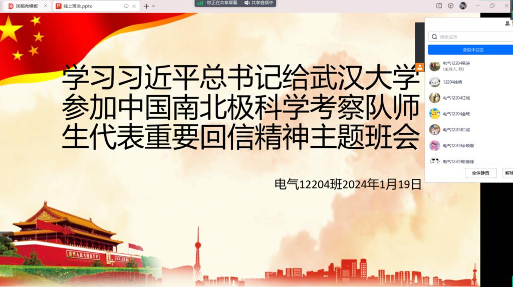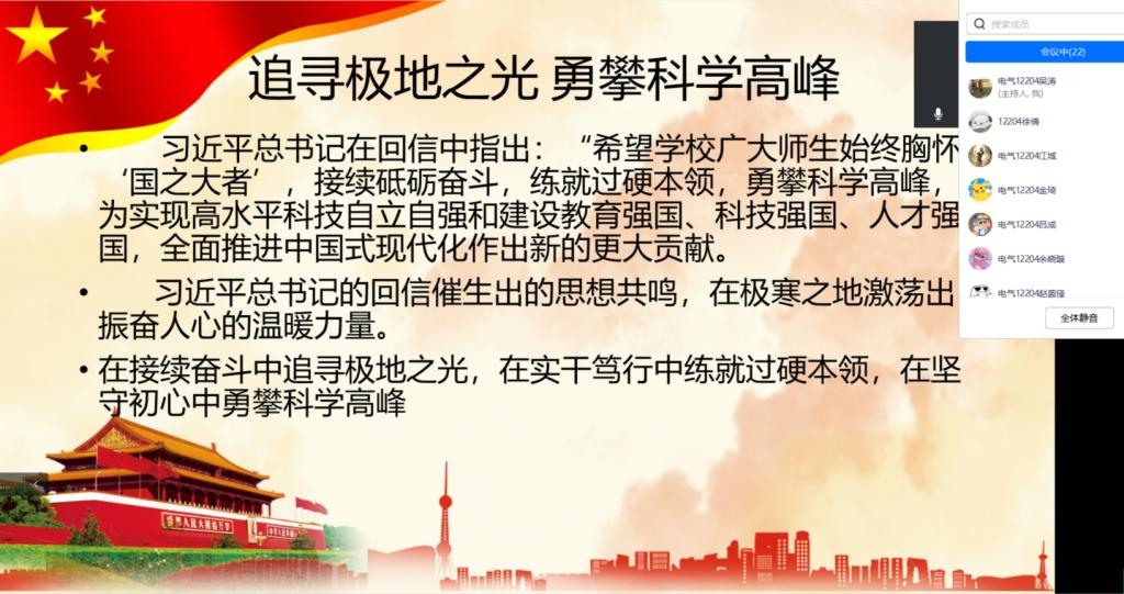 班会包括理论学习和学习心得交流两个部分。各班班长带领同学共同学习习近平总书记给武汉大学参加中国南北极科学考察队师生代表重要回信精神相关内容,深刻领会习近平总书记对广大师生要始终胸怀“国之大者”,接续砥砺奋斗,练就过硬本领的深刻内涵。