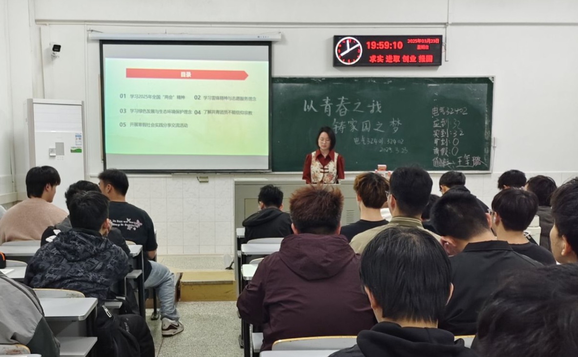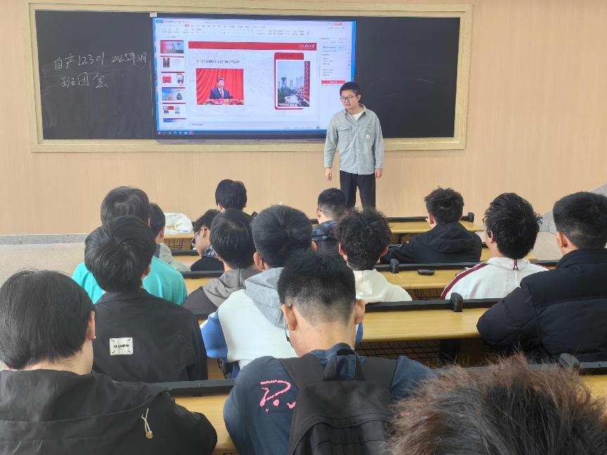 电气32401团支部于3月23日晚八点在西校区5教216教室举办班团会。卢娇洋同学先是围绕2025年全国两会精神,结合实例解读习近平总书记重要讲话,让同学们对国家政策有更清晰的认识。随后,在雷锋精神与志愿服务、绿色发展等讲解中,主持人设置互动环节,引导同学们身体力行践行环保行动。同时,“共青团员不能信仰宗教”专题教育筑牢了团员的思想防线。团课尾声开展寒假社会实践分享,团员们互相交流彼此的优秀作品,提高了同学们彼此之间的了解。此次内容丰富的团课,极大提升了同学们的思想认识,激励他们以实际行动为国家发展注入青春力量。