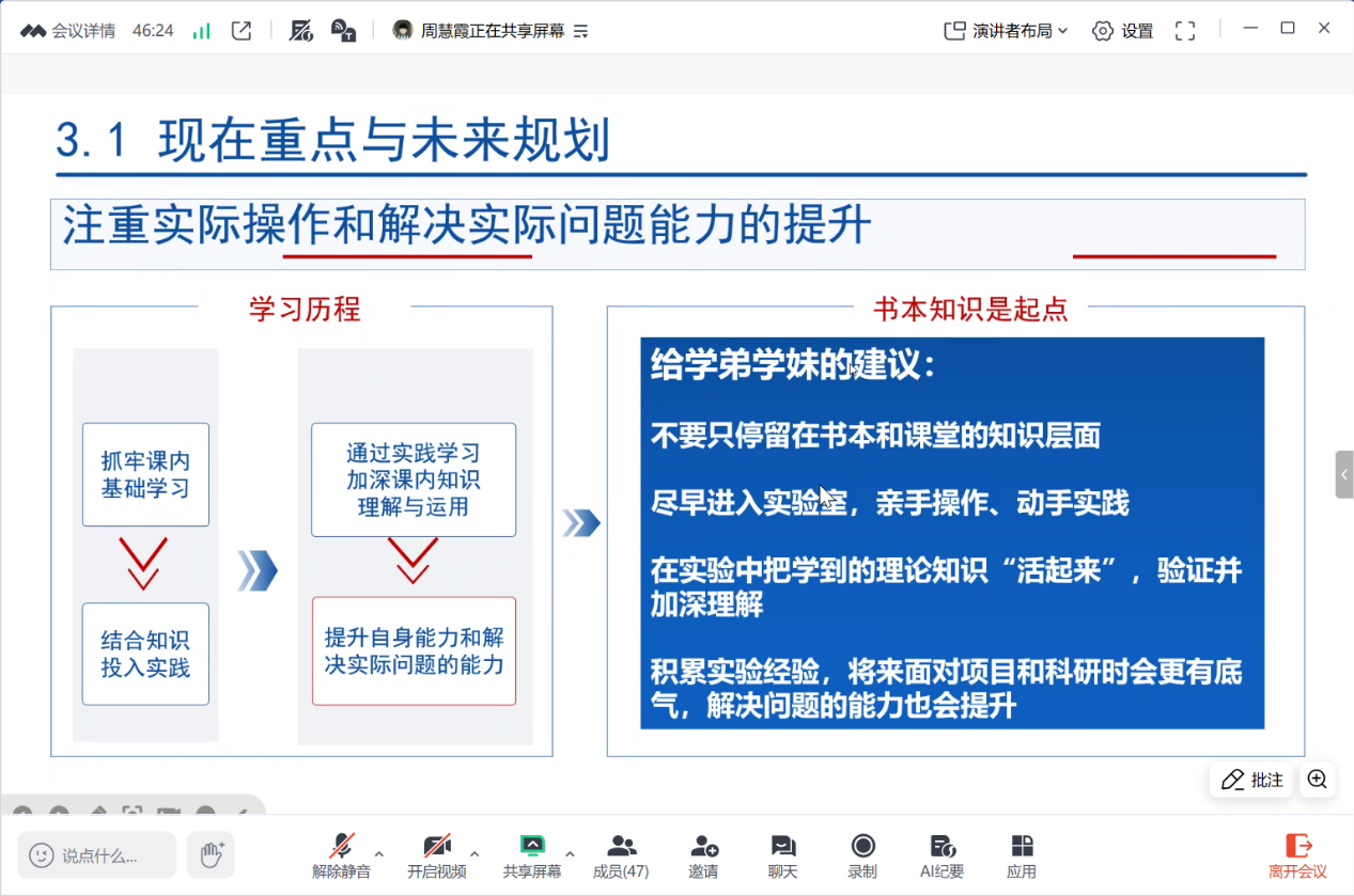 朋辈导师计划实施办法》,鼓励朋辈之间相互协助相互进步。新生入学前,组织线上班会,邀请来自不同年级、不同专业的优秀学长学姐,围绕学业规划、学习方法、大学生活、人际关系处理等多个维度展开分享。学业规划方面,有学长建议新生“大一重点适应大学学习节奏,打好数学、英语、专业基础课底子;大二明确专业细分方向,开始接触专业核心课程与实验室项目;大三根据个人目标准备就业、考研或出国深造;还有学长学姐分享了自己的课堂笔记,为大家补充了学习专业知识的技巧。
