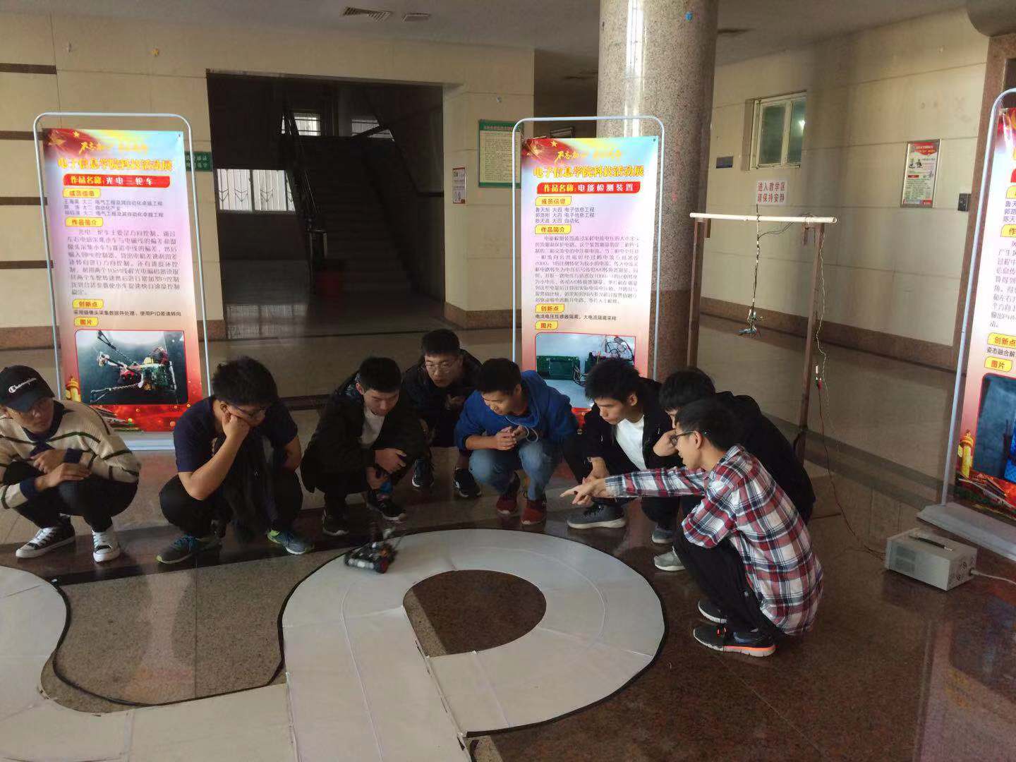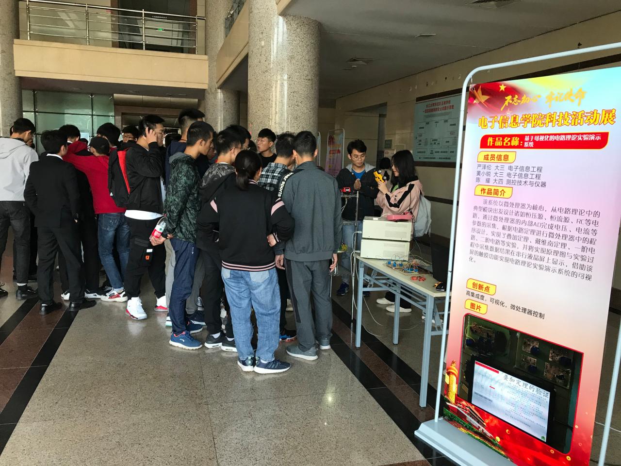 (通讯员 许友维) 10月19日上午9时,结合“不忘初心、牢记使命”主题教育,电子信息学院科技作品展在主教一楼大厅拉开帷幕,本次科技作品展的主题为“创新电信,智领未来”。电信学院党委书记刘逸,院长孙祥娥、副院长蔡昌新出席了本次活动。2019级新生在学长学姐们的引导下参观了此次科技作品展,同时走进实验室,听实验员老师介绍实验室仪器、设备,熟悉实验室用途,感受科技魅力。