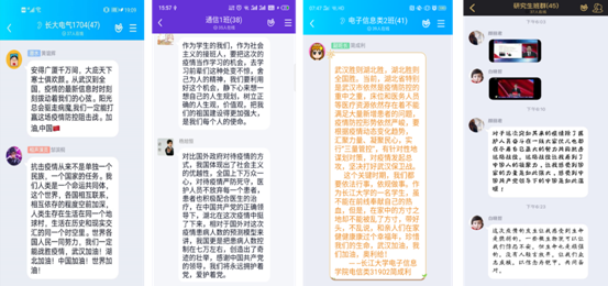 课程结束后,同学们纷纷在QQ群里写下了自己的感悟,电信学子表示在疫情防控这个思政大课堂上深刻体会到了中国共产党和中国特色社会主义制度的显著优势,更加坚定了“四个自信”。同时坚信我们必将在以习近平同志为核心的党中央坚强领导下打赢这场疫情防控战争。作为电信学子,在日后的学习中会不断提升思想理论水平,提高硬核本领,用奋斗的青春书写责任与担当。
