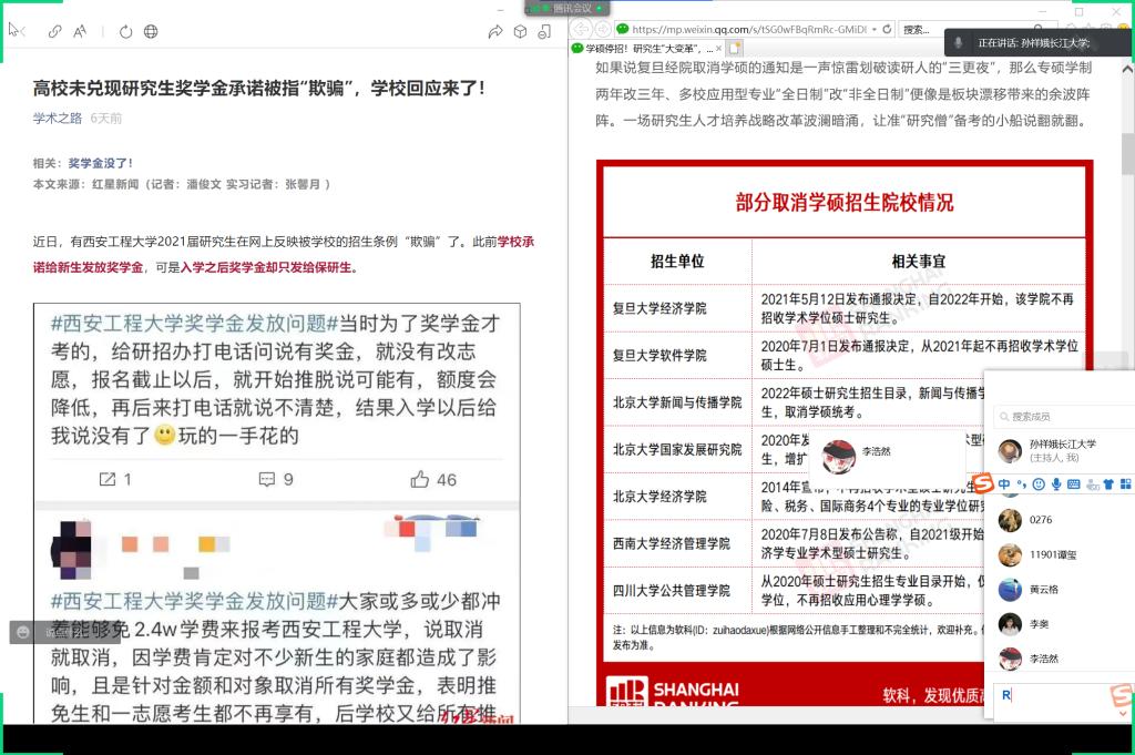 2021年11月12日下午,电子信息学院召开关于研究生教育发展趋势的线上会议。电信学院院长孙祥娥受邀为本次会议进行主持和讲解,通信11901班和11902班全体学生通过腾讯会议参会。