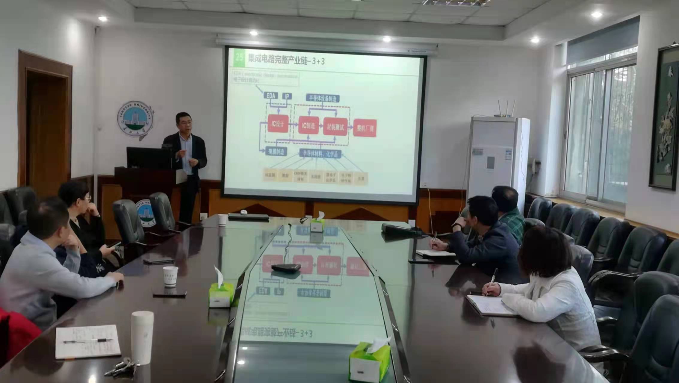 文伟结合中国集成电路行业背景,讲述了我国集成电路的发展现状,从中兴、华为等被卡脖子事件,阐述了芯片发展的战略地位以及我们面临的机遇和挑战。交流中文伟结合自己在外企的工作经历,以及上海张江科学城在芯片和人工智能方向的定位,从集成电路的产业链条,集成电路设计、IC制造、封装测试等多个方面阐述了未来学院可以发展的方向,并表示愿意将育山教育在集成电路和人工智能方面的资源对接至学院,积极参与支持学院的专业建设。