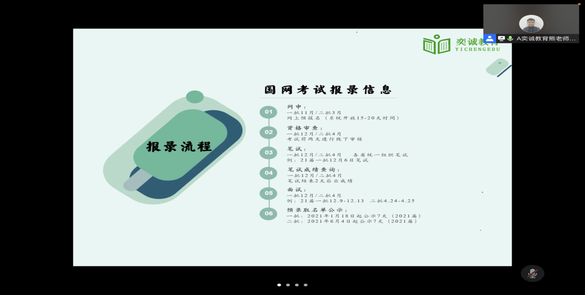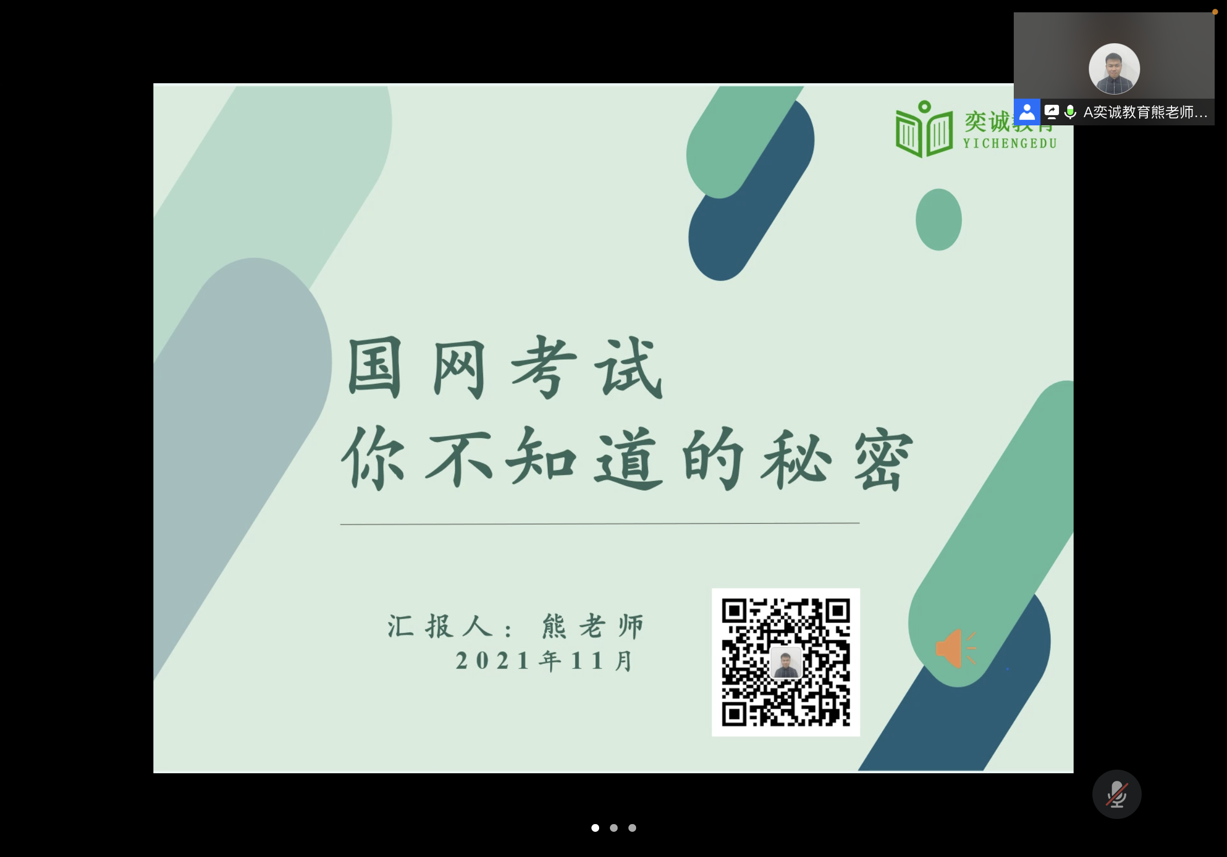 毕业生的就业和未来职业规划发展,为同学们提供专业的就业指导,学院于12月5日晚20:00通过线上腾讯会议的方式开展了“国网考试——你不知道的秘密”国家电网备考攻略主题讲座,本次讲座邀请了来自奕诚教育具有丰富的国考培训教育经验的熊军老师担任此次会议的主讲人,19级、20级电气专业学生参加此次主题讲座。