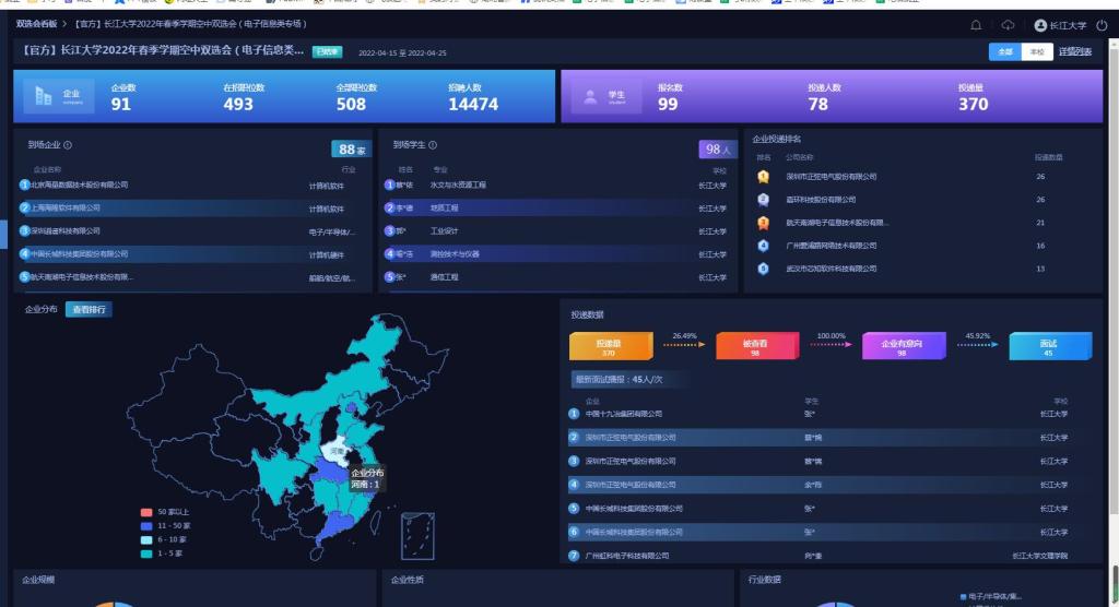 本次线上双选会邀请校企合作及校友企业91家,提供岗位数493个。学生报名数99人,简历投递人数78人,投递量370,被查看99份,企业意向99份,查看意向率达100%,面试人数46人,面试率达46.46%。学生凭借个人兴趣与选择向用人单位积极报名,投递简历,并进行视频面试。