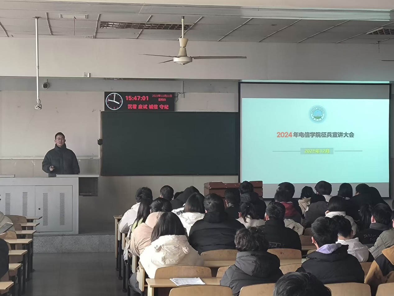 (通讯员 周汶琦)为进一步做好征兵政策宣传,激发学院学子参军入伍积极性,12月21日,学院于12教302室召开2024年春季征兵宣讲大会,大会邀请2020级退役大学生士兵周丽军宣讲,会议由征兵专干沈马锐老师主持。