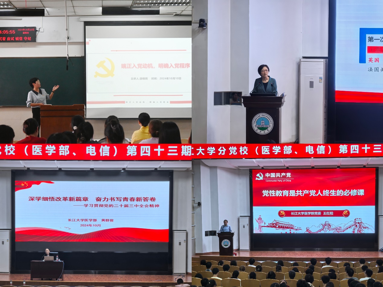 本次培训邀请4位校内理论专家围绕入党程序、党的二十届三中全会精神、中国式现代化、增强党性修养等主题进行培训。党委组织部副处级组织员游晓莉以《端正入党动机,明确入党程序》为题授课,从入党动机、入党程序和入党材料等方面阐述了党员入党基本知识。荆州市委宣讲团成员、马克思主义学院党委书记刘小燕以《从历史演进中理解中国式现代化》为题作报告,从中国式现代化的历史渊源讲起,全面生动地介绍了中国式现代化的特征、本质要求、战略安排、重大原则和历史意义等问题。医学部党委书记黄群俊以《深学细悟改革新篇章 奋力书写青春新答卷》为题,从主题的由来、重大意义、部署安排和创新特点等方面深入解读了党的二十届三中全会精神。医学部正处级组织员王红松以《党性教育是共产党人终生的必修课》为题展开授课,阐述了党性和讲党性的内涵,带领大家学习了习近平总书记关于加强党性修养的重要论述,强调了加强党性修养的主要途径。