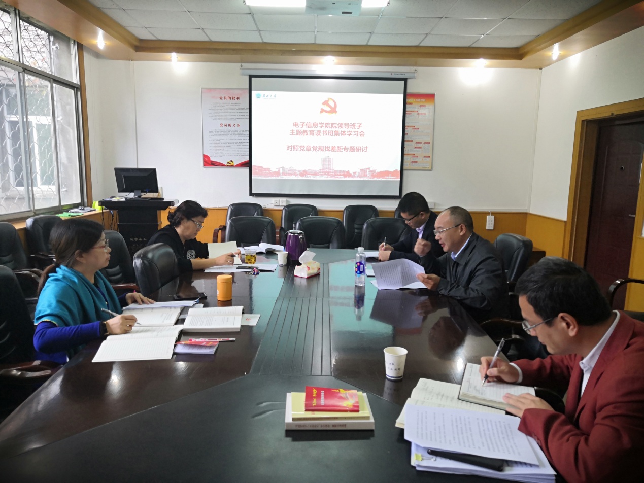为了弘扬优良师德师风,落实立德树人根本任务,讨论如何更有效地服务全院师生,20191111日上午90010203会议室,电信学院领导班子举办主题教育读书班第十次集中学习——对照党章党规找差距专题会议,会议由分党委书记、主题教育工作领导小组组长刘逸同志主持。院长孙祥娥、副院长蔡昌新、分党委副书记郭启炜参加专题会议。