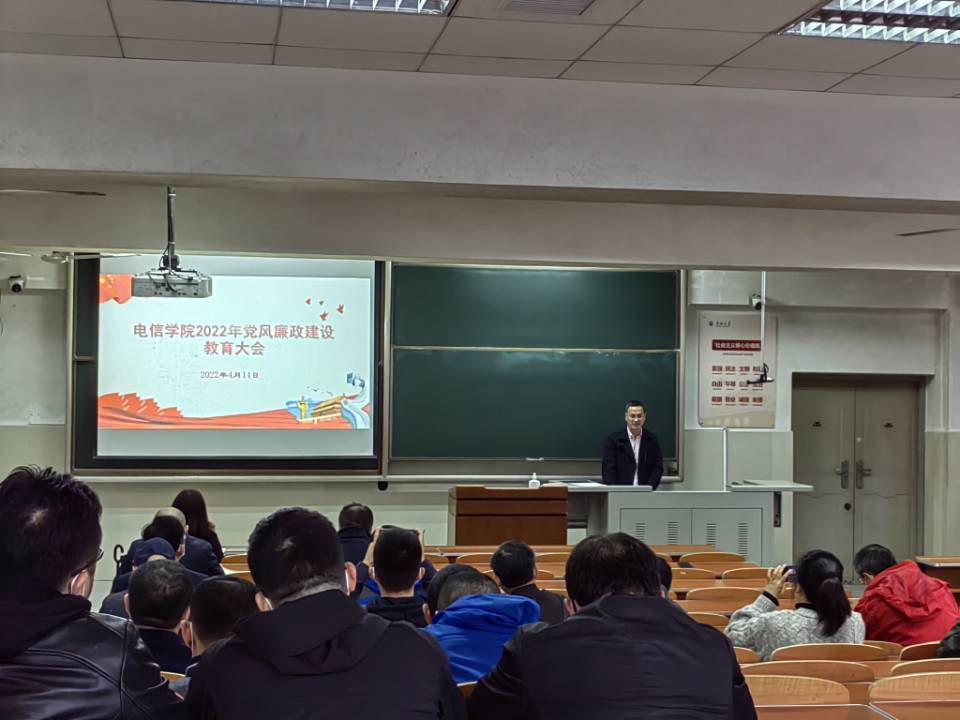 4月14日下午,在主教108教室,学院党委副书记郭启炜在本年度学院党风廉政建设教育大会上向全院教职工传达了学校纪委“加强同级监督、政治生态分析研判工作布置会”会议精神,会上带领全院教职工一起学习了《中共亚洲av 委员会关于推进清廉长大建设的实施方案》、《中共亚洲av 委员会关于推进风清气正政治生态建设的实施办法(试行)》、《校纪委 “5384”行动计划推动清廉长大建设》等文件精神,解读《筑牢“清廉电信学院”建设工作方案》,详细讲解了“筑牢清廉电信学院”的四个工程(“政治清明”建设工程,“院风清朗”示范工程,“教风清正”保障工程,“学风清新”培育工程)和12个方面的内容(压实全面从严治党主体责任、加强党员干部思想政治教育、弘扬“拼、抢、严、实”工作作风、加强清廉班子建设、加强清廉机关建设、加强清廉支部建设、加强清廉系部建设、落实立德树人根本任务、落实教师学习和培养机制、引导教师规范自身言行、推动“清廉文化”进班级和落实“三全育人”新途径)。