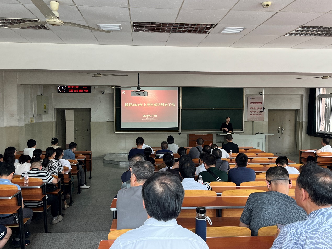 首先,郭梅通报了上半年学院意识形态工作开展情况。她从思想理论武装、意识形态阵地管理、师德师风建设三个方面介绍了学院在理论学习、党纪学习教育、意识形态分析研判、新媒体清查、师德师风建设等方面的工作进展。