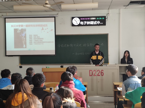 第一届研究生讲师团以“学党史知新中国史 ,铸信仰话成长”为主题,在我校开展系列教育活动。2019年12月5日,研究生讲师团走进电子信息学院,电信学院研究生辅导员赖文慧老师以及电信学院全体研究生于13教D226教室,参加了本次主题教育活动。