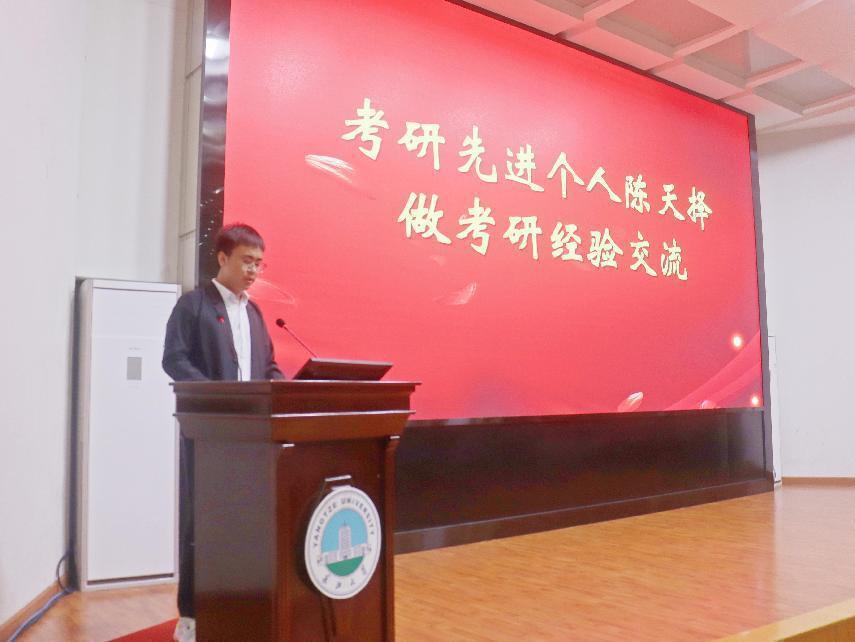 “选择要大于努力,向着正确的选择努力,厚积薄发,最终一定能抵达终点!”“坚定信念,所有认真的汗水终会结成秋天的硕果!”颁奖完毕后,2022届考研先进个人胡子健、陈天择先后上台分享考研与学习经验。