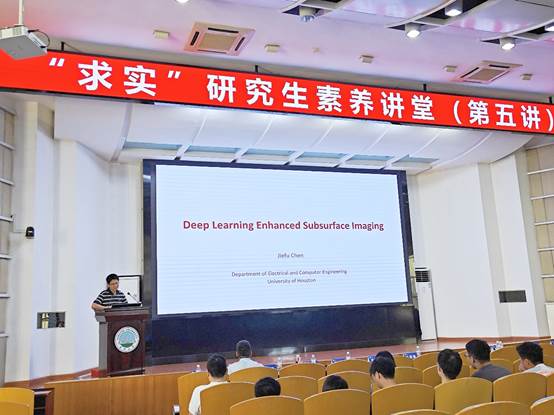 陈杰夫老师报告的题目是《深度学习增强地下成像》。他在报告中分享了自己最新的研究进展情况,并对如何利用机器学习和人工智能来克服研究挑战、如何运用物理知识指导下的深度学习来解决反演问题等进行了详细的讲解。