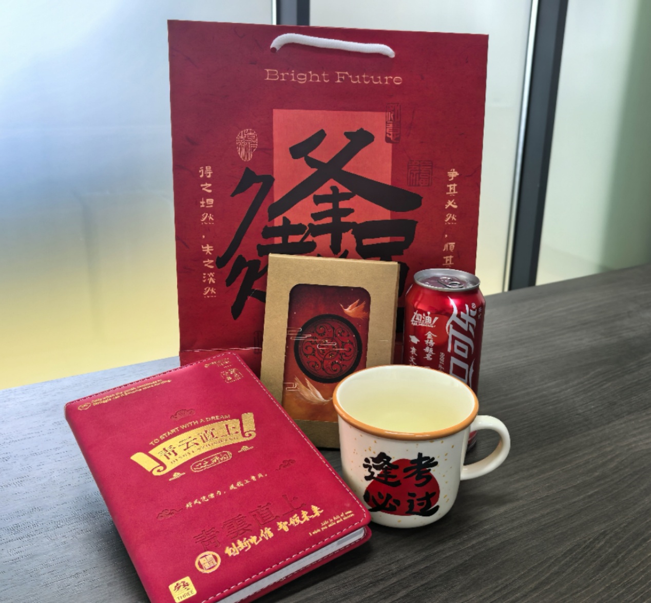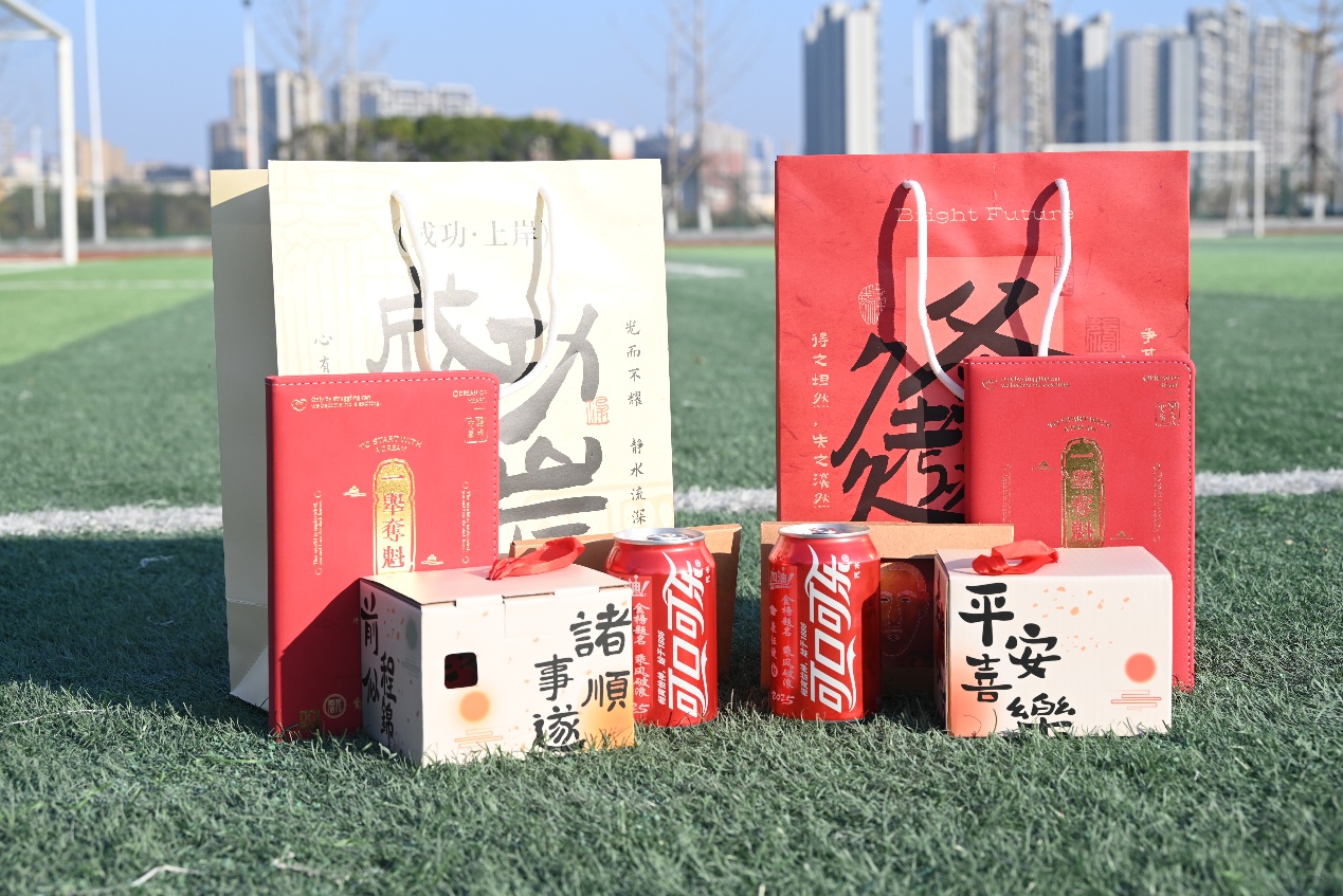 手提袋印制“逢考必过”“成功上岸”等加油语,真诚祝愿每一位考生考试顺利、研途坦荡。红色定制笔记本封面印有学院logo及“创新电信 智领未来”标语,祝福大家“顶峰相见”。定制版可乐刻印学生姓名以及“金榜题名 乘风破浪”等祝福语,寓意“百事可乐,一切顺利”。“逢考必过”幸运杯祝福考研学子诸事顺遂,一战成硕。另外还精心挑选了10张荆州博物馆联名的明信片,祝福大家成功上岸。